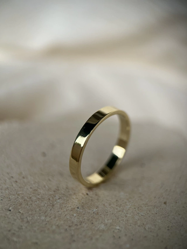 Aliança em Ouro 18k (cor do Ouro à escolha do cliente - podendo ser Ouro Branco, Ouro Champagne, Ouro Amarelo ou Ouro Rosa), robusta (não é uma peça frágil ou fina), com design flat (reto) e largura de 3mm.