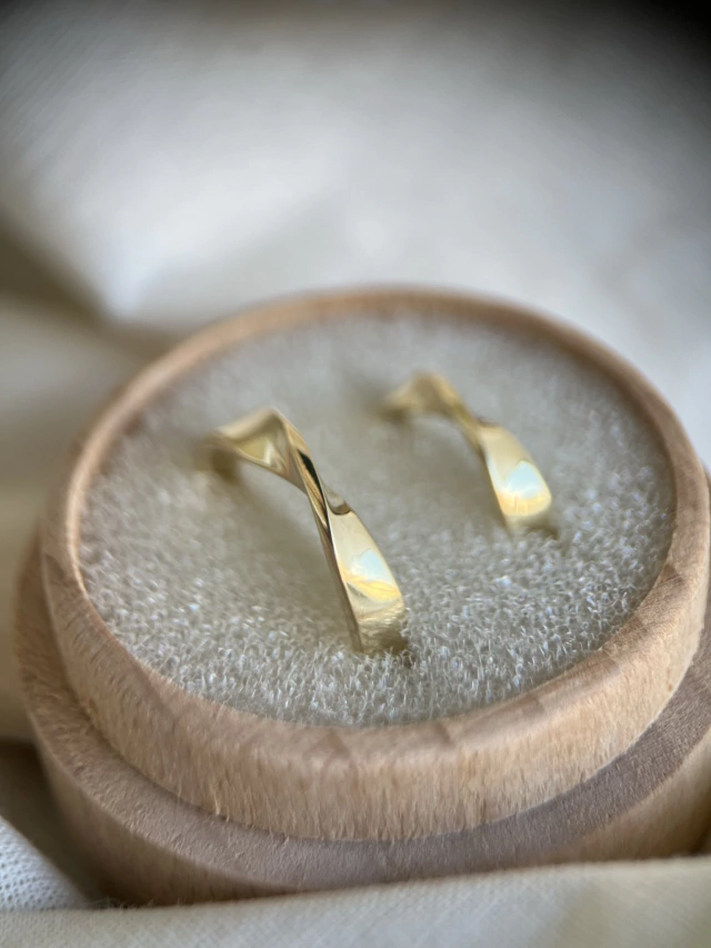 Aliança em Ouro 18k (cor do Ouro à escolha do cliente - podendo ser Ouro Branco, Ouro Champagne, Ouro Amarelo ou Ouro Rosa), robusta (não é uma peça frágil ou fina), com largura de 4mm e torção na parte superior da peça.