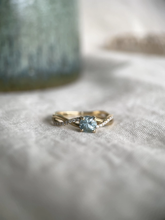 Nesta versão, a pedra central é uma Água Marinha na lapidação redonda, o que traz uma beleza suave e um brilho delicado à joia. A Água Marinha é uma pedra preciosa da família dos berilos, conhecida por sua cor que lembra as águas cristalinas do mar. Considerada uma pedra de serenidade e equilíbrio, a Agua Marinha é associada à calma, clareza mental e proteção emocional.