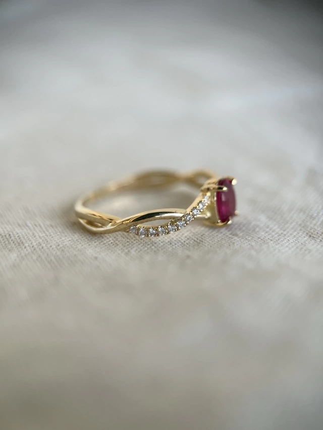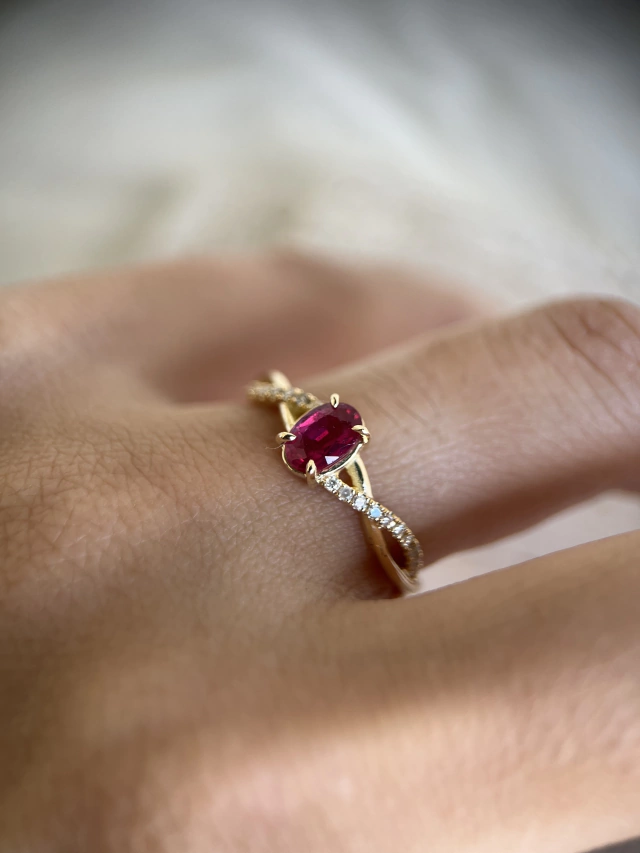Anel em Ouro 18k (cor do Ouro à escolha do cliente - podendo ser Ouro Branco, Ouro Champagne, Ouro Amarelo ou Ouro Rosa), com rubi central oval e diamantes de meio ponto cada nas laterais.