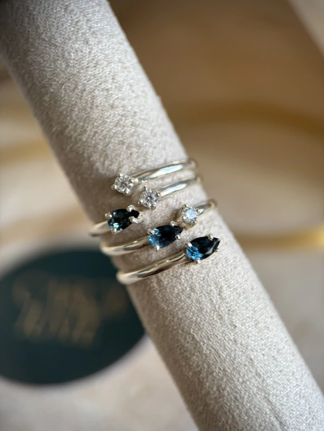 O Topázio London é uma pedra de azul intenso, profundo e envolvente. Seu tom lembra um céu noturno iluminado por poucas estrelas, trazendo uma sensação de elegância, introspecção e tranquilidade. É uma gota que guarda profundidade, aquela luz que aparece aos poucos, com calma.