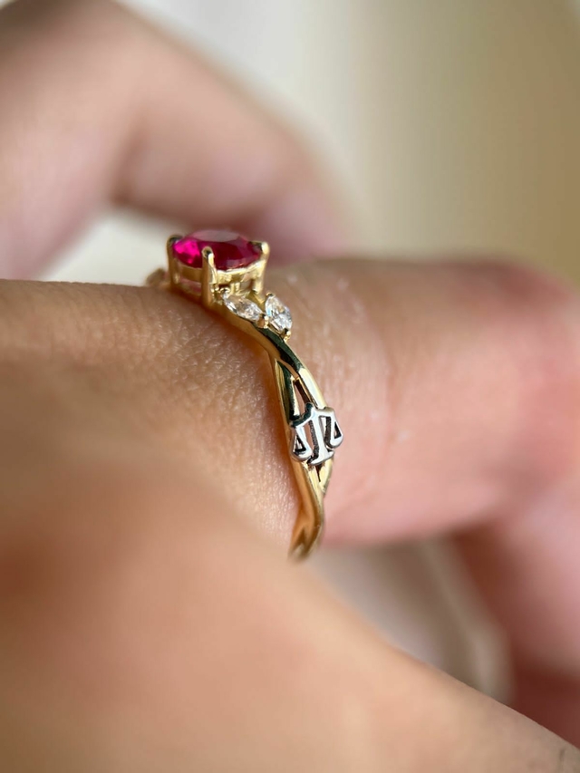 Anel em Ouro 18k (cor do Ouro à escolha do cliente), com pedra central natural (rubi, esmeralda, safira, ametista ou citrino) em tamanho 5mm e 4 diamantes em lapidação navete (lapidação rara). Símbolo do curso nas laterais do anel.