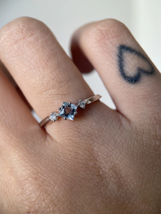 Anel em Ouro 18k (cor do Ouro à escolha do cliente - podendo ser Ouro Branco, Ouro Champagne, Ouro Amarelo ou Ouro Rosa), robusto (não é uma peça frágil ou fina), com design autoral torcido nas laterais, pedra em lapidação carrê (quadrada) 4mm, com 2 diamantes de 2 pontos aproxidamente nas laterais.