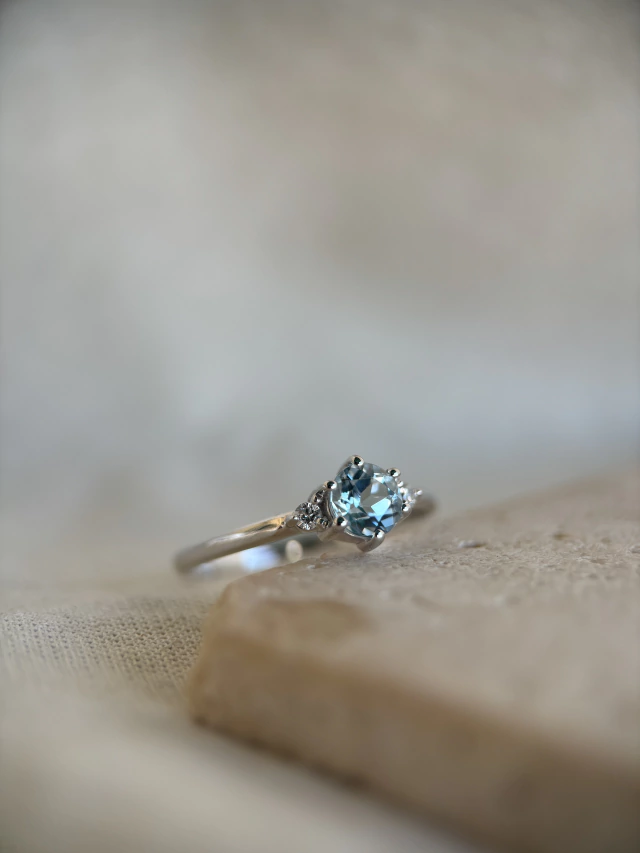 Anel em Ouro 18k (cor do Ouro à escolha do cliente - podendo ser Ouro Branco, Ouro Champagne, Ouro Amarelo ou Ouro Rosa, robusto (não é uma peça frágil ou fina), com pedra natural central de Água Marinha 5mm e 2 diamantes de 2 pontos cada.