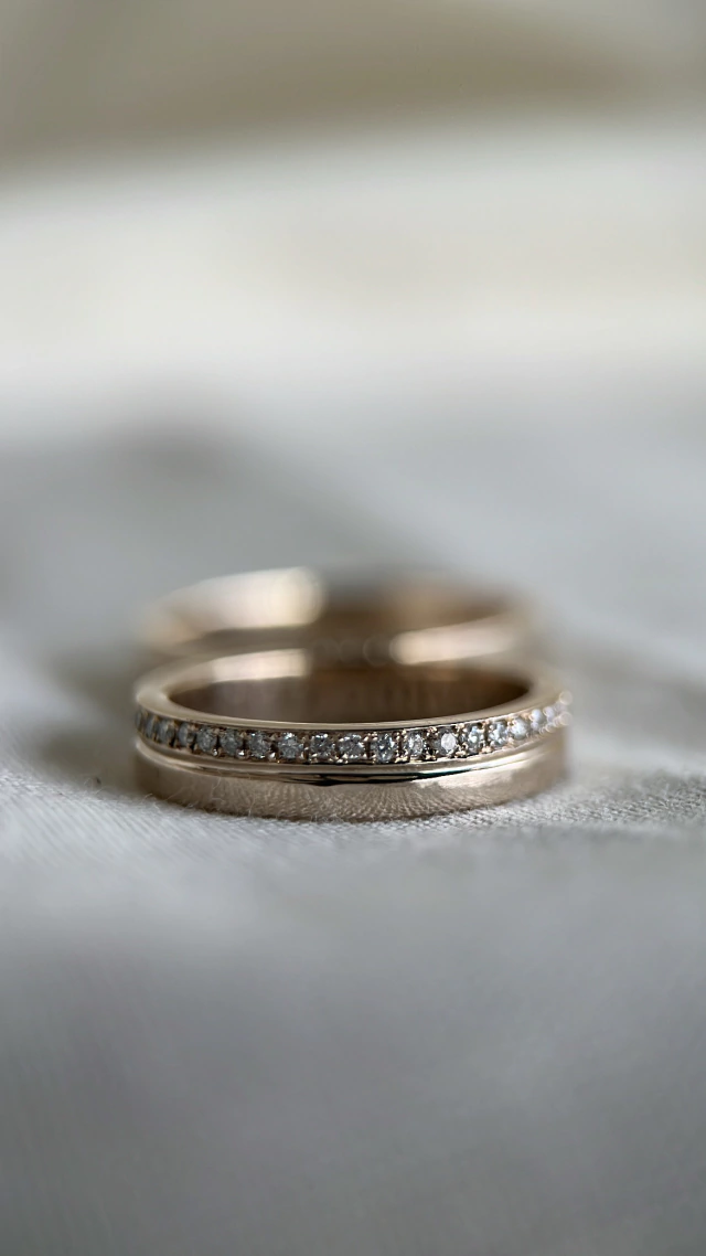 A aliança feminina possui um friso central e é cravejada de diamantes de meio ponto cada até a metade.