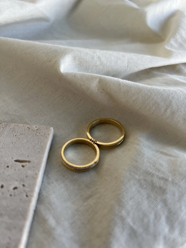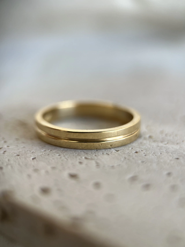Aliança em Ouro 18k (cor do Ouro à escolha do cliente - podendo ser Ouro Branco, Ouro Champagne, Ouro Amarelo ou Ouro Rosa), robusta (não é uma peça frágil ou fina), com design flat (reto) e largura a ser definida pelo cliente.