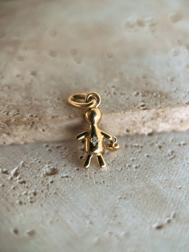 Menininho de aproximadamente 12mm (sem contar a argola) em Ouro 18k maciço (não é uma joia oca), feita para durar para sempre. Ela possui um coração (que simboliza o coração de mãe) sempre junto à ela, e uma pedra de diamante cravada no vestidinho. O diamante simboliza a eternidade de um amor entre mãe e filho, nunca perde sua força e seu brilho.
