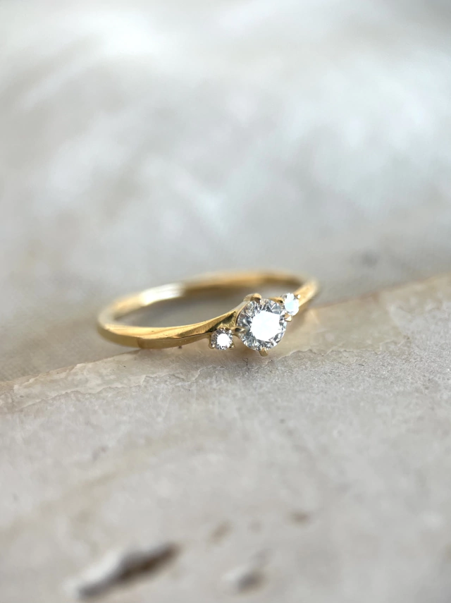 Anel em Ouro 18k (cor do Ouro à escolha do cliente - podendo ser Ouro Branco, Ouro Champagne, Ouro Amarelo ou Ouro Rosa), robusta (não é uma peça frágil ou fina), com diamante central de 20 ou 25 pontos e diamantes laterais de 2 pontos cada (1.75mm).