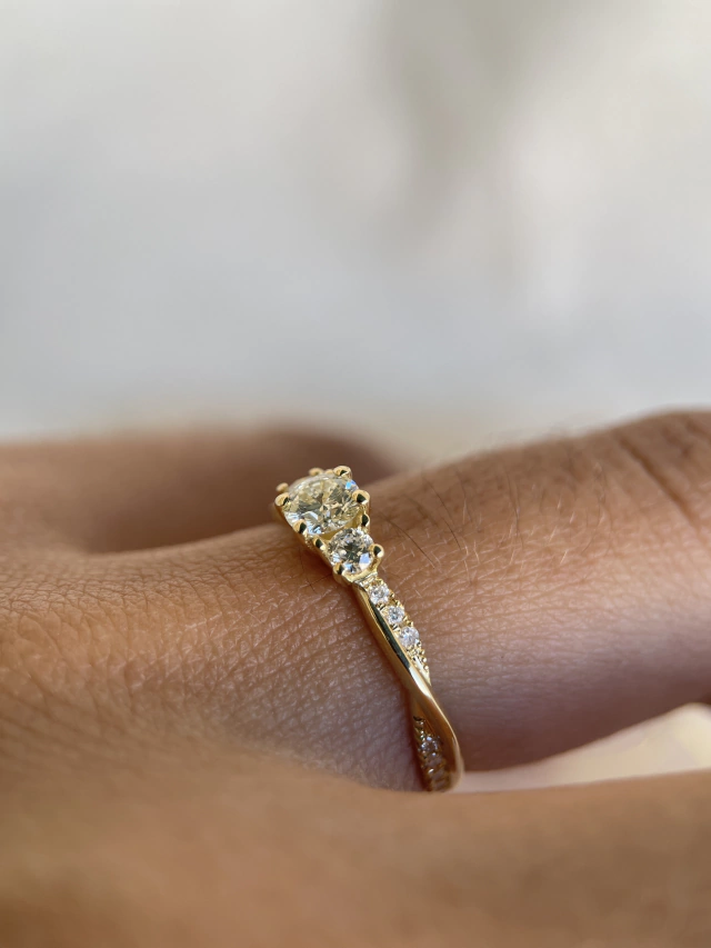 Anel em Ouro 18k (cor do Ouro à escolha do cliente - podendo ser Ouro Branco, Ouro Champagne, Ouro Amarelo ou Ouro Rosa), robusto (não é uma peça frágil ou fina), com design autoral feito à partir de fios entrelaçados de Ouro, cravejado com diamante central de 25 pontos, 2 diamantes de 6 pontos cada e diamantes de meio ponto cravejados até a metade do aro.