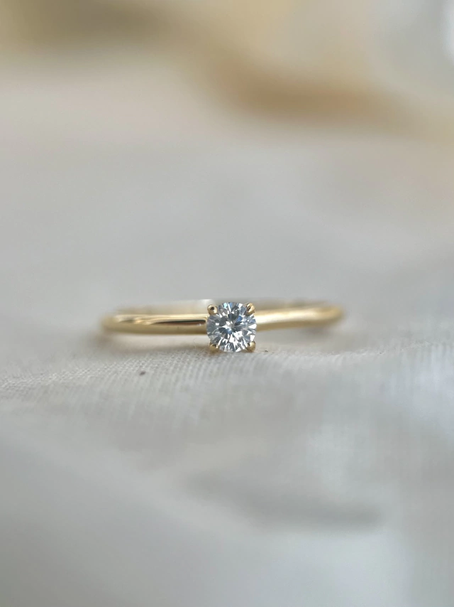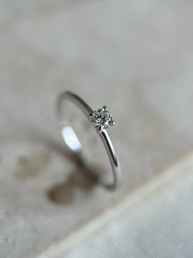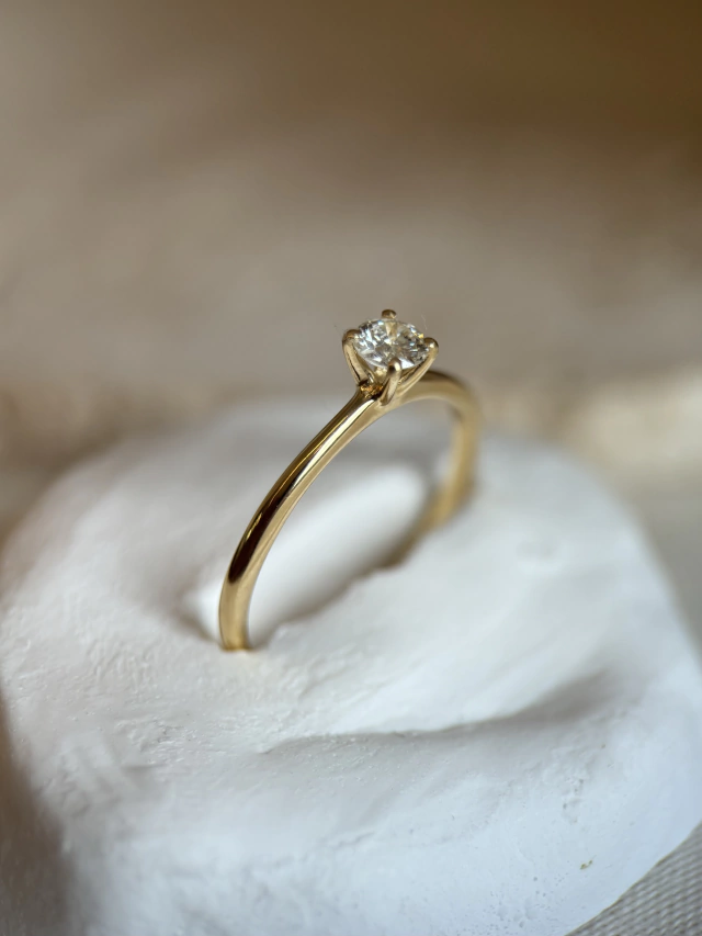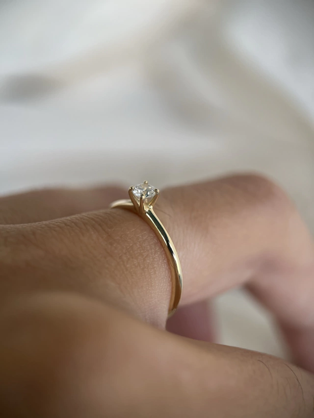 Anel em Ouro 18k (cor do Ouro à escolha do cliente - podendo ser Ouro Branco, Ouro Champagne, Ouro Amarelo ou Ouro Rosa), robusto (não é uma peça frágil ou fina), com design clássico de solitário com diamante 15 pontos.